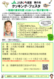 地域の農産物の美味しさ、良さを知っていただく為、クッキング・フェスタを開催します。テレビ「キューピー3分クッキング」に出演する宮本和秀先生の講演会と地元野菜を使用した試食会を行います。皆様お誘い合わせの上、ぜひご来場ください。 |