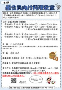 管内在住の組合員、組合員家族の方を対象に料理教室を開講します。